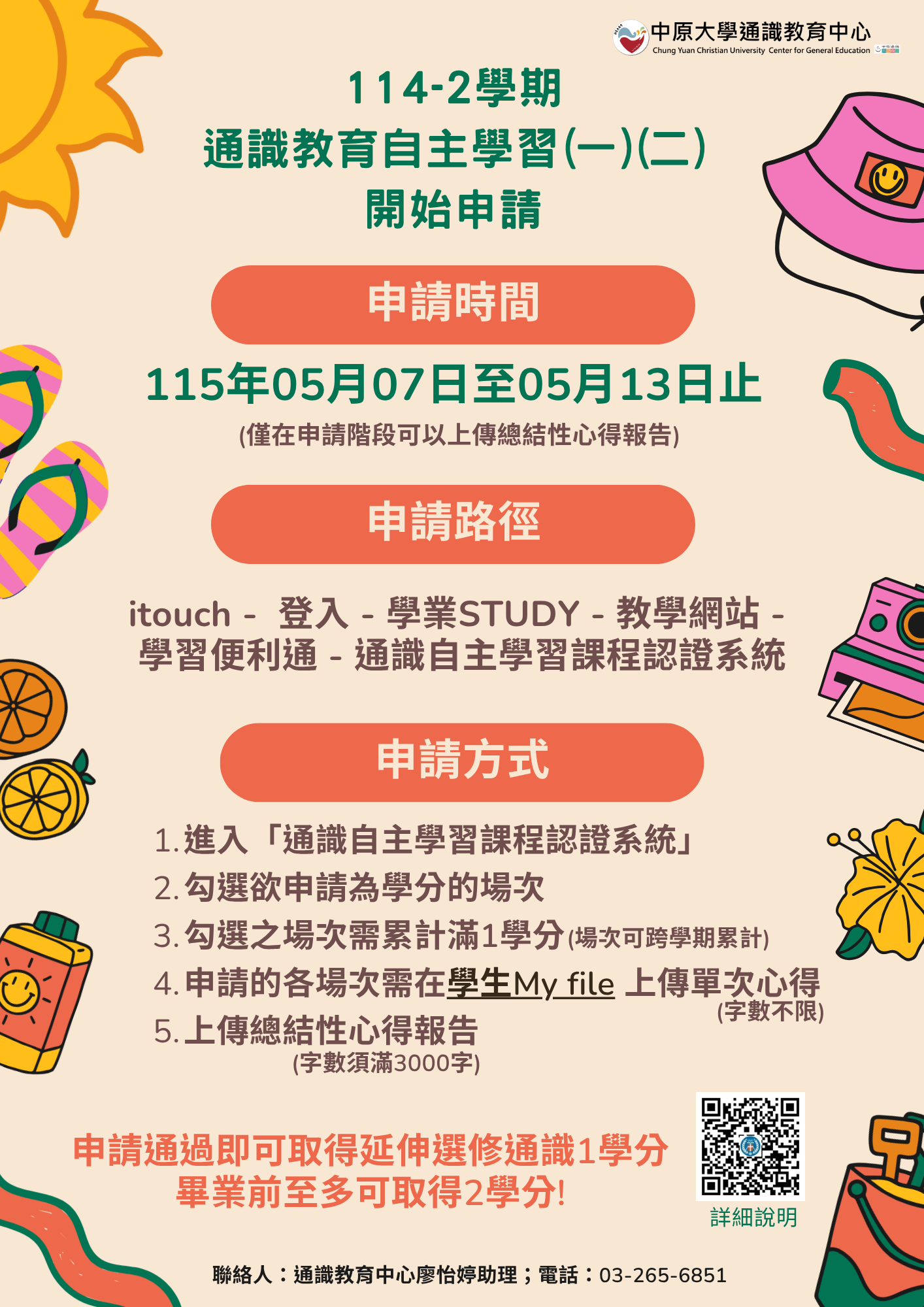 - 【通識中心】114-2 學期通識自主學習學分 5月7日~5月13日開始申請! https://itouch.cycu.edu.tw/active_project/cycu1200h_06/ann/spa/#/annList?SN=100361