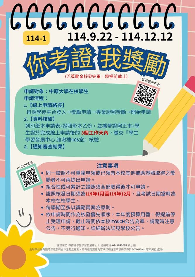 【再次提醒】114-1中原大學學生考取【專業證照獎勵】已開始申請!